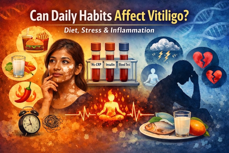 In brief: A February 2026 study from India compared 80 adults with vitiligo to 80 matched controls. It explored everyday patterns — diet routines and stress-related habits — and also measured inflammation (Hs-CRP) and insulin. People with vitiligo had higher average Hs-CRP and higher insulin than controls. This does not prove cause-and-effect, but it points to practical questions worth testing in larger, follow-up studies.